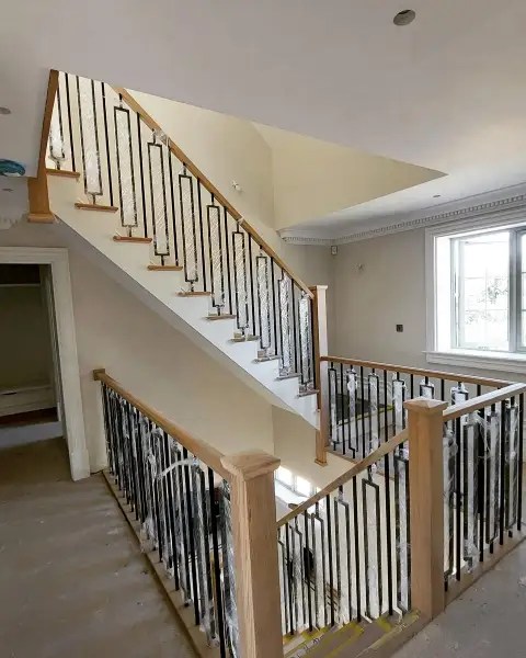 This custom wooden staircase project features a two-flight design, constructed with high-quality Tulipwood for the cut string. The combination of Tulipwood with European Oak treads, handrails, and newel posts creates a striking contrast and adds a touch of elegance to the overall structure. The integration of metal box section spindles further enhances the modern aesthetic, providing both strength and style.